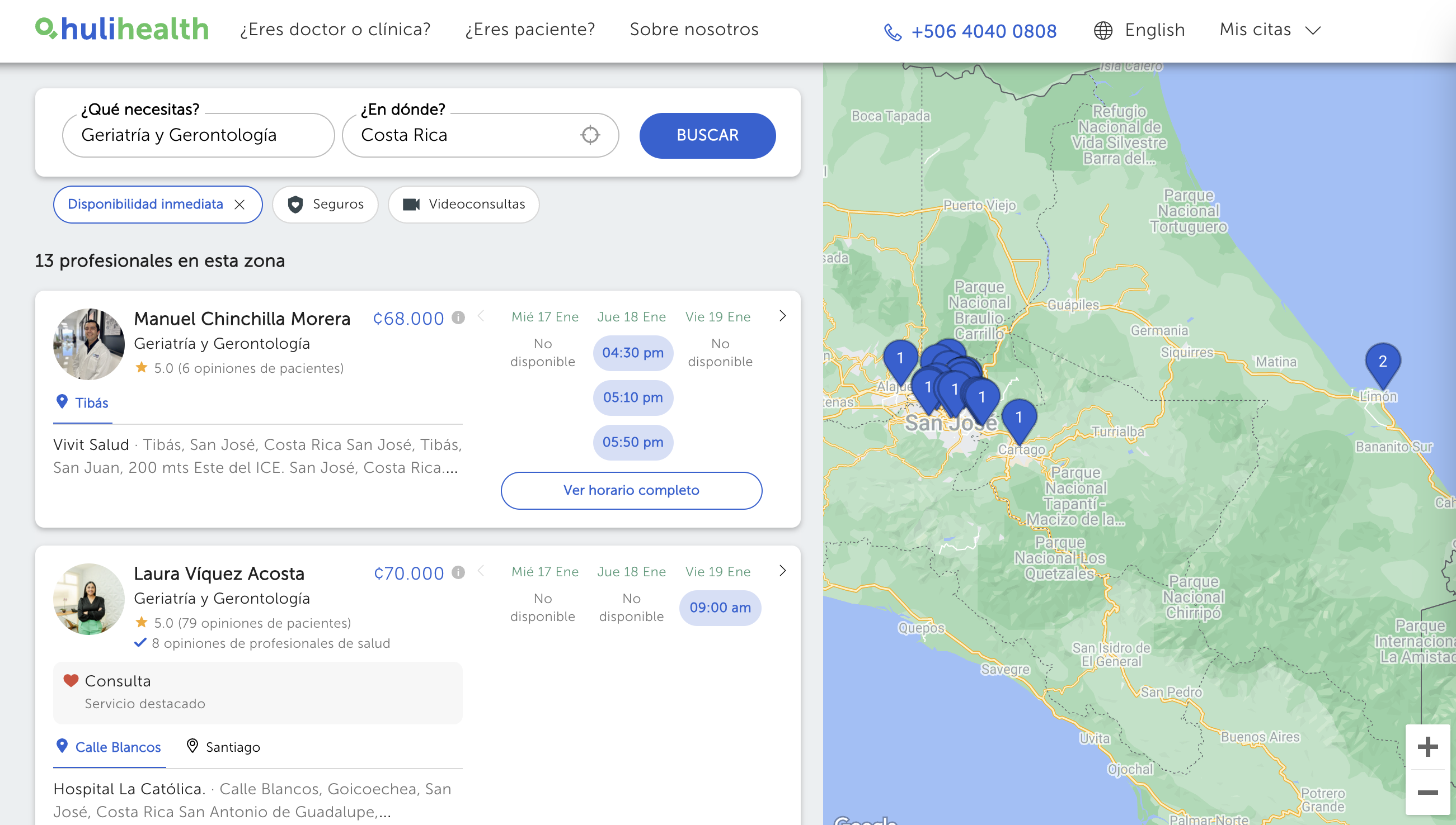 Ingresando a HuliHealth podrás encontrar más de una quincena de especialistas en geriatría y gerontología. Si estás buscando una cita con un especialista, podés elegir la zona que más te convenga para tu facilidad, incluso la posibilidad de un geriatra a domicilio.El precio de una cita con uno de estos especialistas puede ir de los ¢50.000 y ¢70.000. En esta misma búsqueda podrás ver las diferentes alternativas de precio.